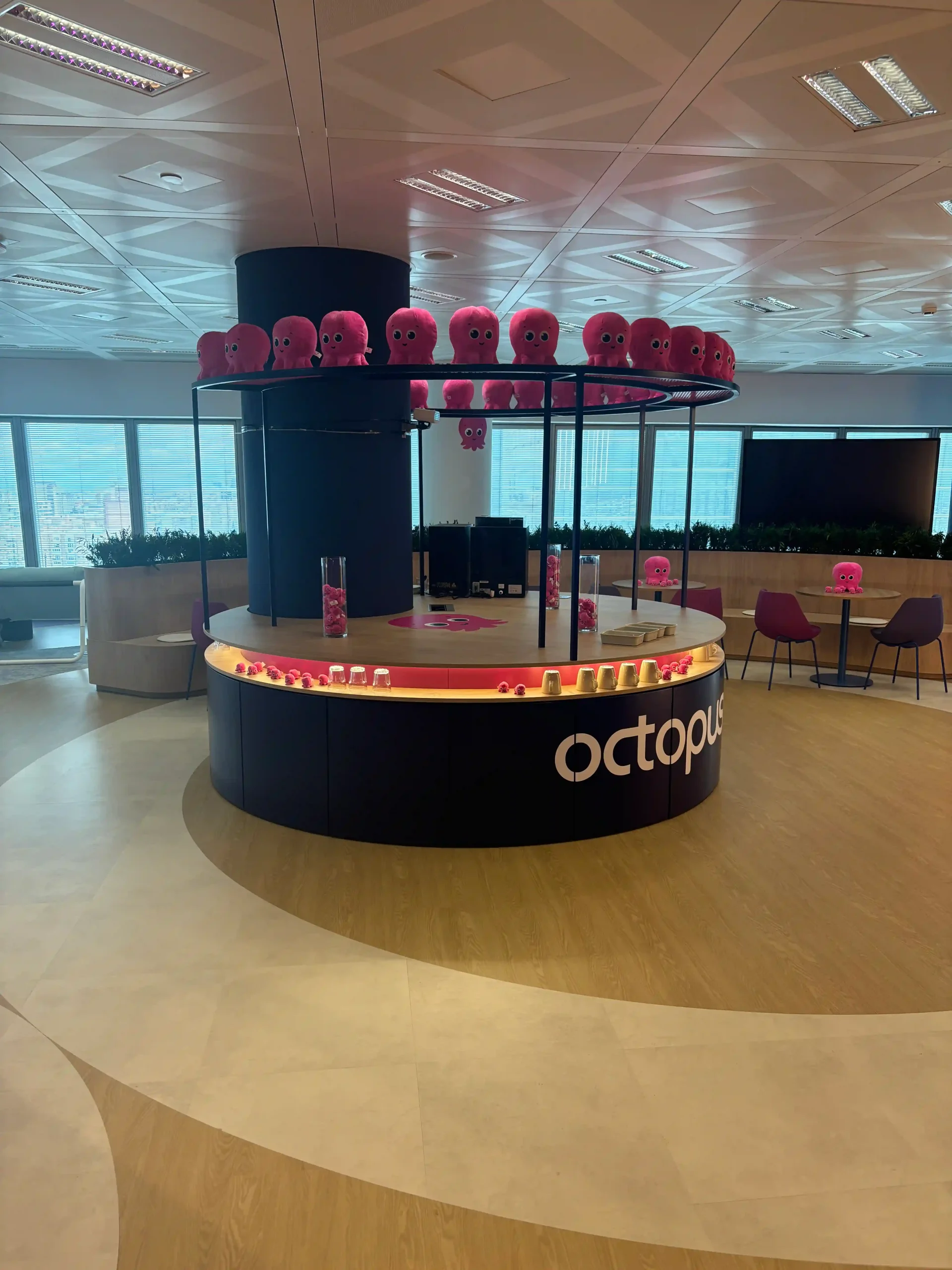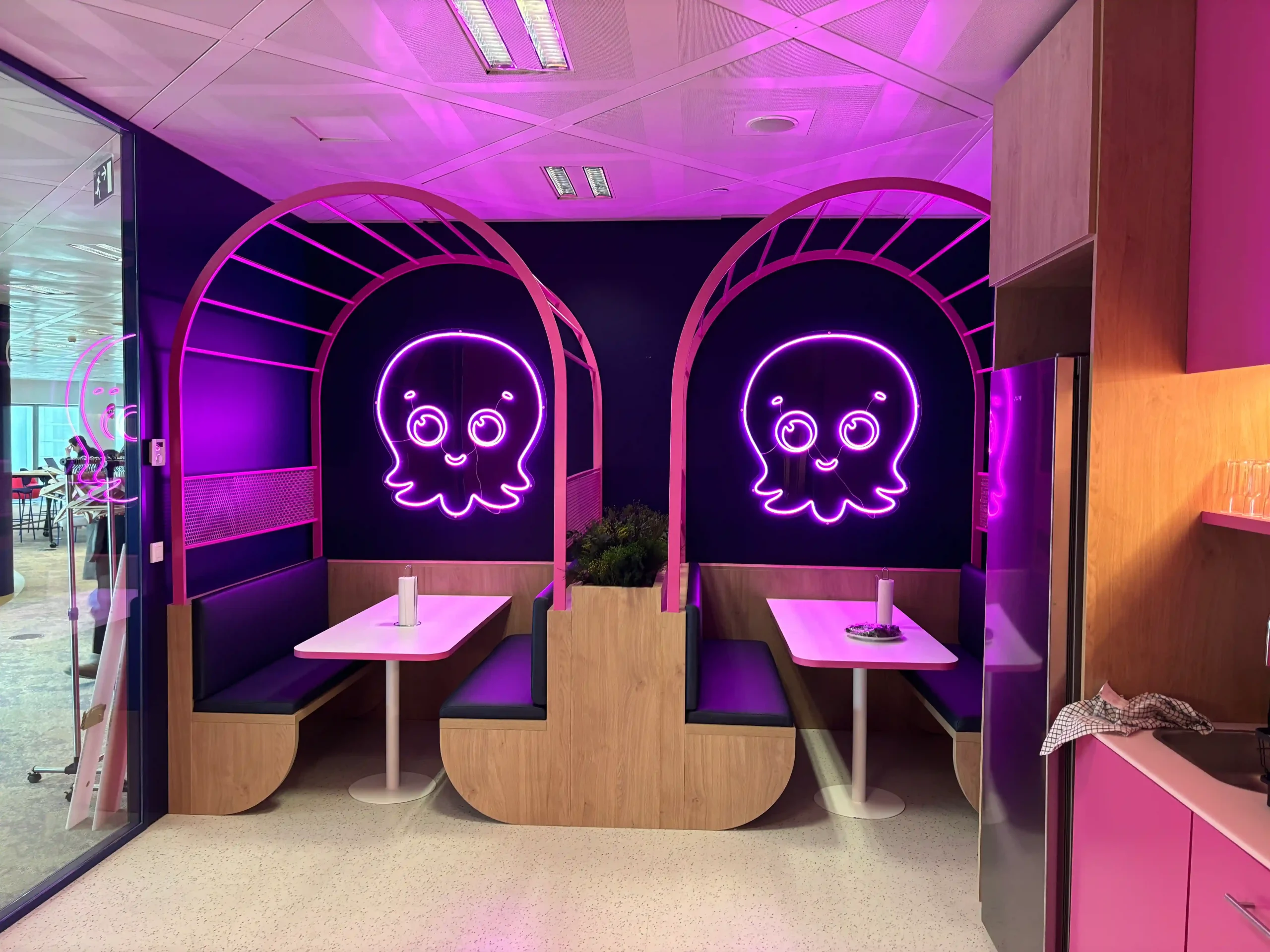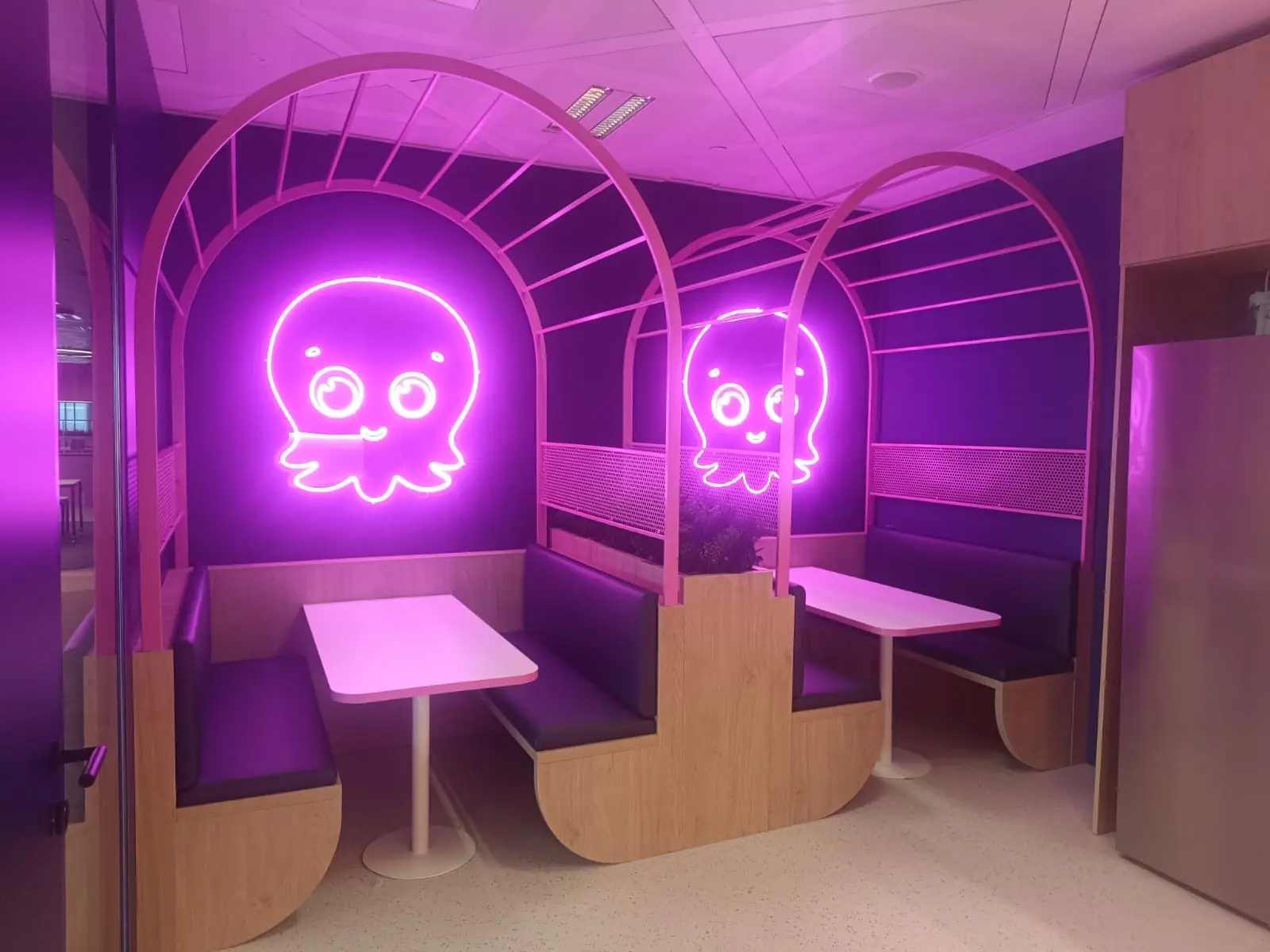 Tuvimos el placer de conocer a este maravilloso equipo, que trabaja codo con codo para dar a las personas una energía limpia y sin complicaciones. Nos contactaron para que les reformáramos la sala común donde el equipo se reúne en sus ratos libres para tomar algo, les construyéramos una estructura de hierro para disimular una estructura previa que interrumpía el flujo de la sala, y la parte más creativa que más orgullosos estamos de cómo lo elaboraron nuestros profesionales, una estructura de hierro gigante, con leds integrados y que se puede transportar por todo el complejo sin dificultad alguna.
